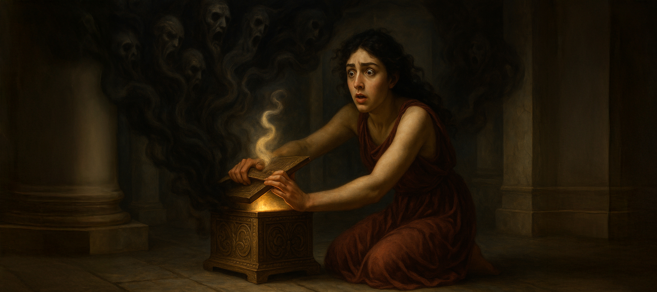 Über die Pandora erzählt uns der Mythos, dass sie nach außen hin wunderschön, liebreizend, süß und voller verzehrender Sehnsüchte ist. Sie erscheint als Urbild des Weiblichen und der ganz und gar weiblichen Schöpfung. Ja, sie ist die Schöpfung selbst. Sie trägt eine geheimnisvolle Büchse bei sich, die es in sich hat. Denn in der Büchse befinden sich alle Übel, Plagen, Krankheiten und Schrecken der dualistischen Welt. Aus Neugierde und auf Zeus Anordnung hin, öffnet sie die Büchse in Anwesenheit des Epimetheus, der der Bruder des Prometheus ist. So kamen die konflikttragenden, leidvollen Kräfte in die Welt. Nur die Hoffnung, die letzte der Kräfte im unzerstörbaren Gefäß, entweicht nicht, da Pandora schnell wieder den Deckel verschließt. Seitdem ist unklar, ob die Hoffnung auch zu den Übeln gehört, oder ob sie, weil sie allein im Gefäß zurückblieb, sozusagen der letzte Strohhalm ist, der dem Menschen geblieben ist in einer Welt, die tendenziell aus Leiden und Konflikten besteht.